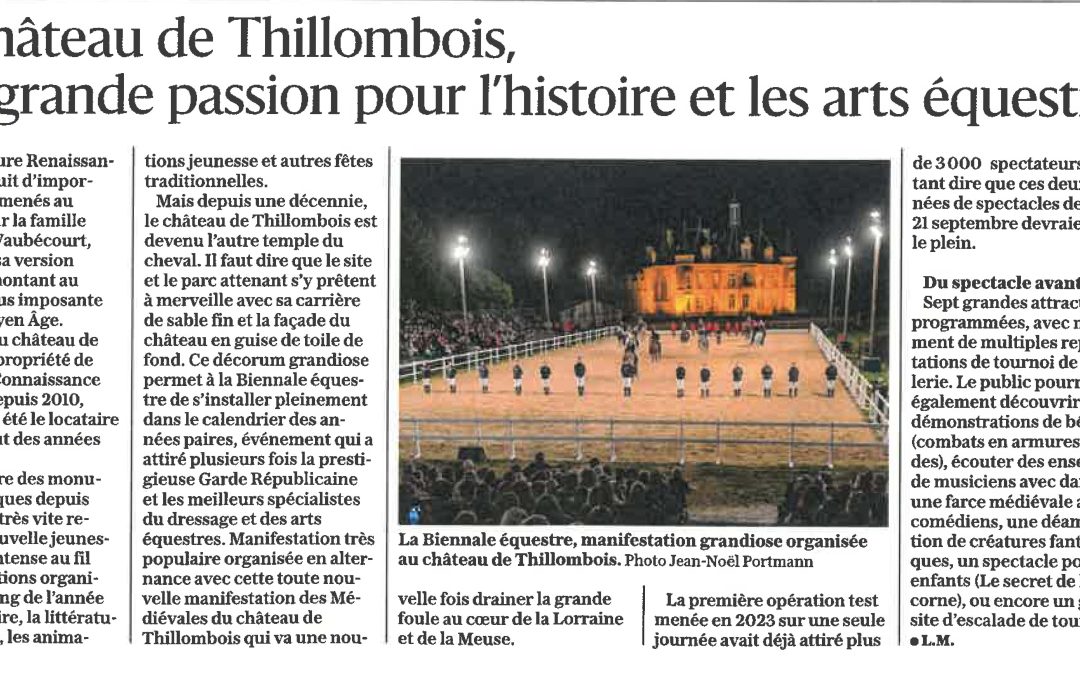 Mais depuis une décennie, le château de Thillombois est devenu l’autre temple du cheval. Il faut dire que le site et le parc attenant s’y prêtent à merveille avec sa carrière de sable fin et la façade du château en guise de toile de fond. Ce décorum grandiose permet à la Biennale équestre de s’installer pleinement dans le calendrier des années paires, événement qui a attiré plusieurs fois la prestigieuse Garde Républicaine et les meilleurs spécialistes du dressage et des arts équestres. Manifestation très populaire organisée en alternance avec cette toute nouvelle manifestation des Médiévales du château de Thillombois qui va une nouvelle fois drainer la grande foule au cœur de la Lorraine et de la Meuse.