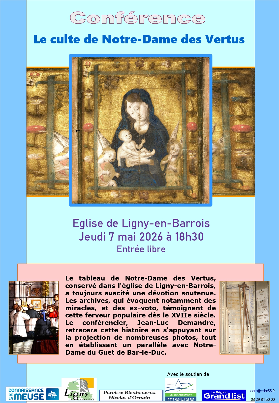 Le tableau de Notre-Dame des Vertus, conservé dans l’église de Ligny-en-Barrois, a toujours suscité une dévotion soutenue. Les archives, qui évoquent notamment des miracles, et des ex-voto, témoignent de cette ferveur populaire dès le XVIIe siècle. Le conférencier, Jean-Luc Demandre, retracera cette histoire en s’appuyant sur la projection de nombreuses photos, tout en établissant un parallèle avec Notre Dame du Guet de Bar-le-Duc.
